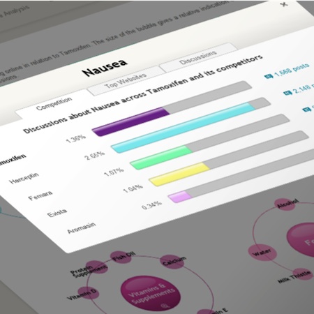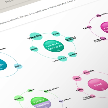 Treato is distinctive in that its designers have a deep understanding of healthcare and have built hierarchical language dictionaries that understand both patients’ own language (e.g. “my chemotherapy makes me feel sick”) alongside professional jargon. Treato Pharma is a service for marketers that taps into this already proven engagement resource. But the genius of Treato Pharma goes behind the data mining and analysis, and expresses itself in a sleek, simple, and fun to use interface. Navigable through interactive infographics, users are able to access data by clicking from broad categories of information and drill down to individual posts to see exactly what the patient said and meant when they talked about their chemo-induced nausea.