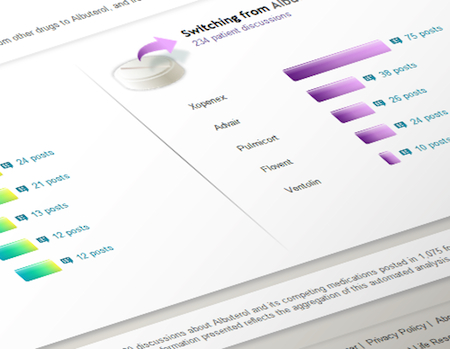 Within the site, extensive competitive analysis sections compare the number of discussions about brands and competitors over time, comparative patient perception, and topics discussed more and less often than competitors. The Drug Switching tab aggregates all the posts about people switching to and from the selected brand, ranking the alternatives in both directions, and providing access to the posts that go into more detail. The Top Websites tab gives a ranked list of which sites include posts about the selected brand, in other words, a recipe for where to be online.